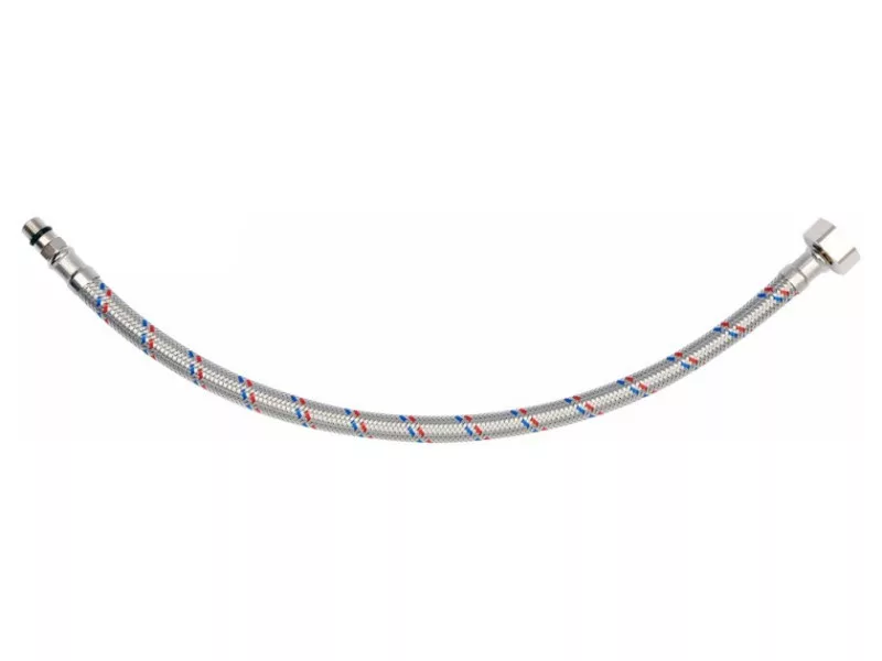 Flexible stainless steel braided connection hose for faucets. It is designed for hot and cold water. It is certified by the PZH for contact with drinking water. Length 400mm. Max pressure 1MPa. Max temp 90st C. Average flow rate 32L/min. Inner diameter 8mm and outer diameter 12mm. Connection thread: female 1/2" x male M10 (17mm short). Rubber hose made of EPDM rubber, nickel-plated brass connections, EPDM rubber gasket. It is designed from the connection of basin and bathtub taps with valves.