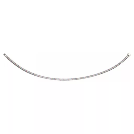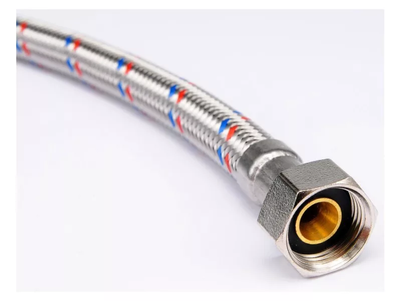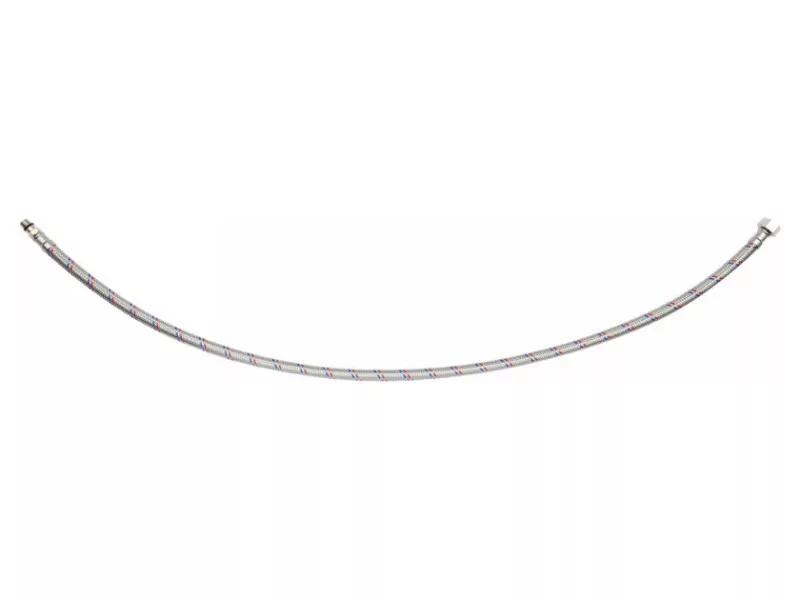 Flexible stainless steel braided connection hose for faucets. It is designed for hot and cold water. It is certified by the PZH for contact with drinking water. Length 800mm. Max pressure 1MPa. Max temp 90st C. Average flow rate 32L/min. Inner diameter 8mm and outer diameter 12mm. Connection thread: female 3/8" x male M10 (17mm short). Rubber hose made of EPDM rubber, nickel-plated brass connections, EPDM rubber gasket. It is designed from the connection of basin and bathtub taps with valves.