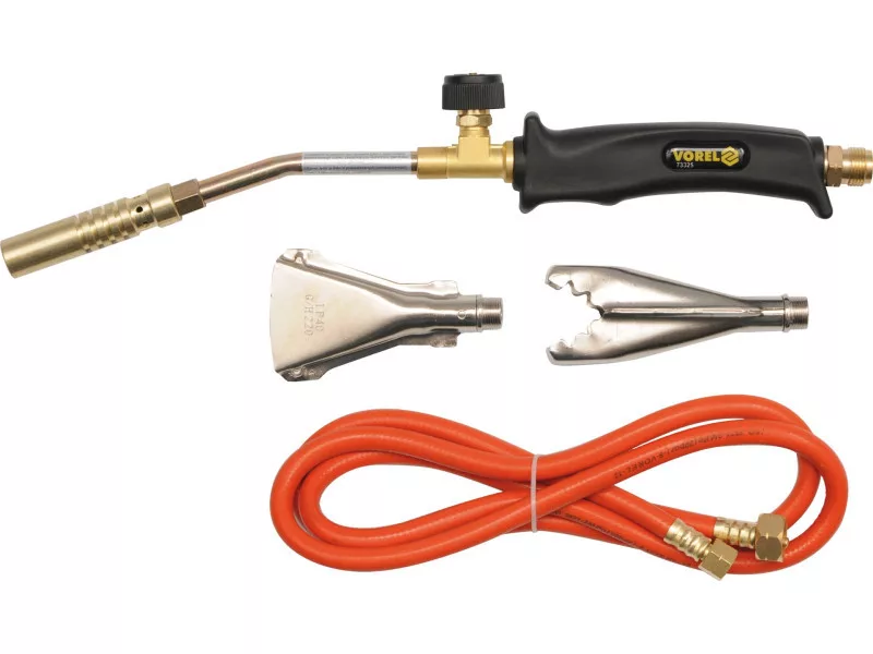 Gas burner set designed for installation work and many applications in other industries. The set includes a universal handle, a special 2m hose with connections to the gas cylinder and handle, and flame shaping nozzles. We can use a 17mm spot nozzle, a 22mm nozzle with a surrounding flame or a 40mm flat nozzle for heating and tanning.
