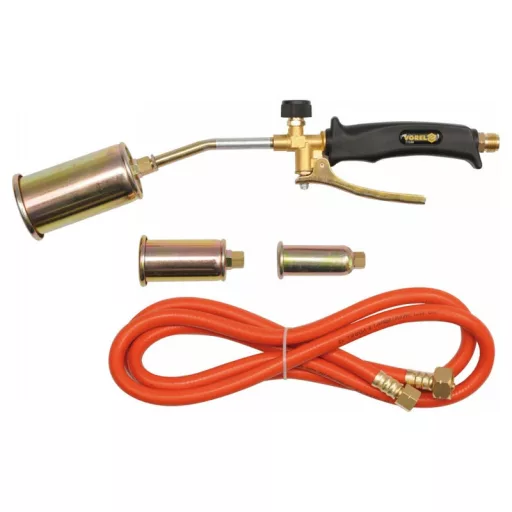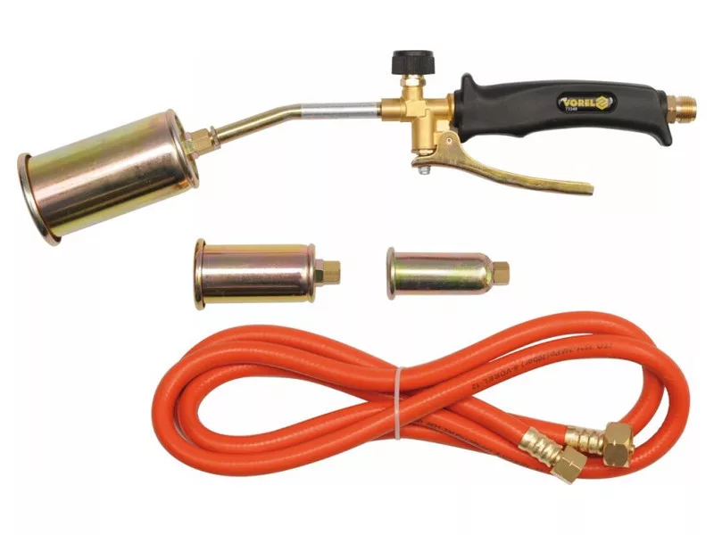Basic set of short roofing burners 73340 designed for typical heat-sealed membrane installation work. Includes handle with valve lever labor saving, hose with connections to the cylinder and handle, and three flame nozzles for intense heating or tanning.