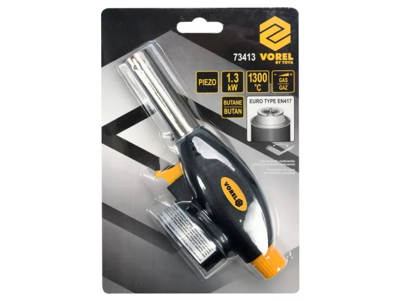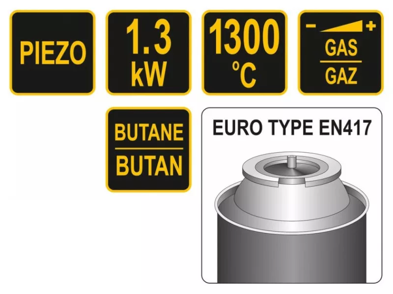 Gas burner 73413 with ignition PIEZO. It is powered by butane gas from an external cylinder - in accordance with EN417. Cylinder connection to the burner type TWIST.