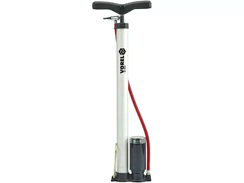 Post pump with pressure gauge, made of aluminum, with a foot for easy pumping. It is equipped with a long 57 centimeter hoseód ending with a universal endófor pumping both bicycle and car valves.