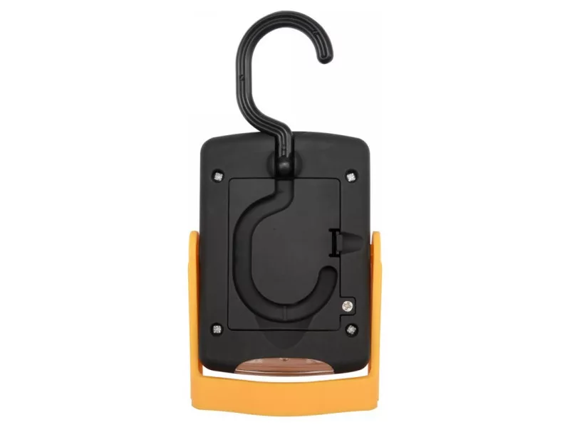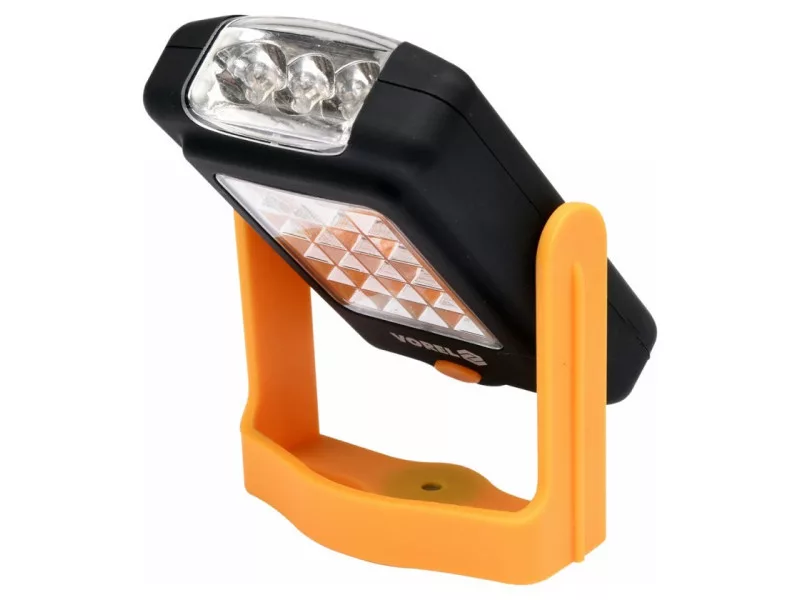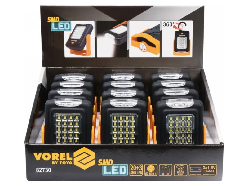 82730 is a handheld lamp equipped with 20 state-of-the-art SMD LEDs providing a robust, diffused light output. The lamp can also emit focused light, serving the function of a flashlight, thanks to three additional LEDs installed on the lamp's forehead. The fixture has a highly functional mounting bracket that can be bent 360 around the body of the lamp. In the base of the holder there is a strong magnet. This arrangement allows the lamp to be positioned anywhere and tilted at any angle, leaving the user's hands free. The fixture also has a folding, rotating hook. The lamp is powered by 3xAAA batteries, which are not included.
