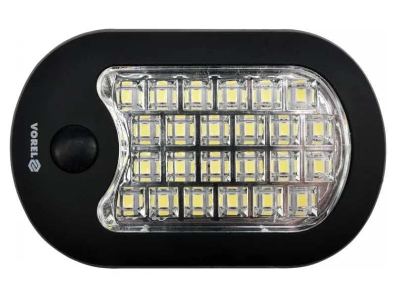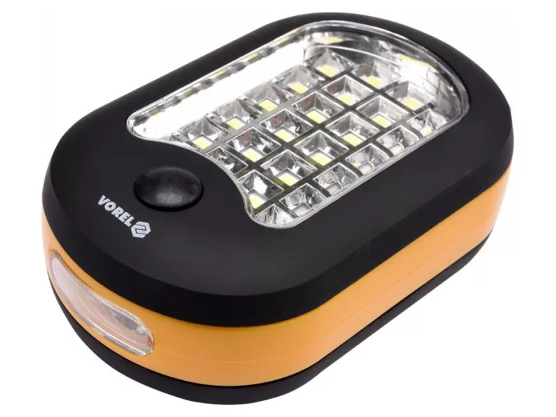 82731 is a handheld lamp equipped with 24 state-of-the-art SMD LEDs providing a solid, diffused light output. The lamp can also emit focused light, serving the function of a flashlight thanks to three additional LEDs installed on the lamp's face. The fixture has a magnet and a folding swivel hook. The lamp is powered by 3xAAA batteries, which are not included. Replacing the batteries does not require a screwdriver.
