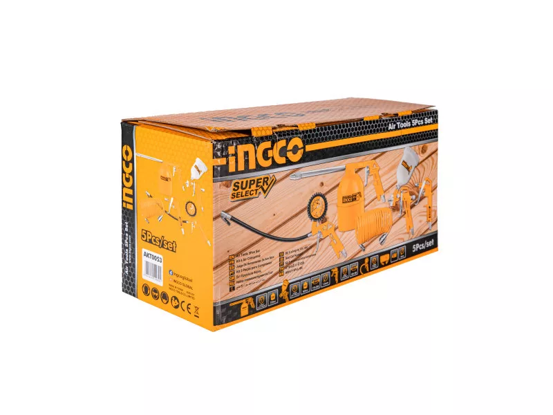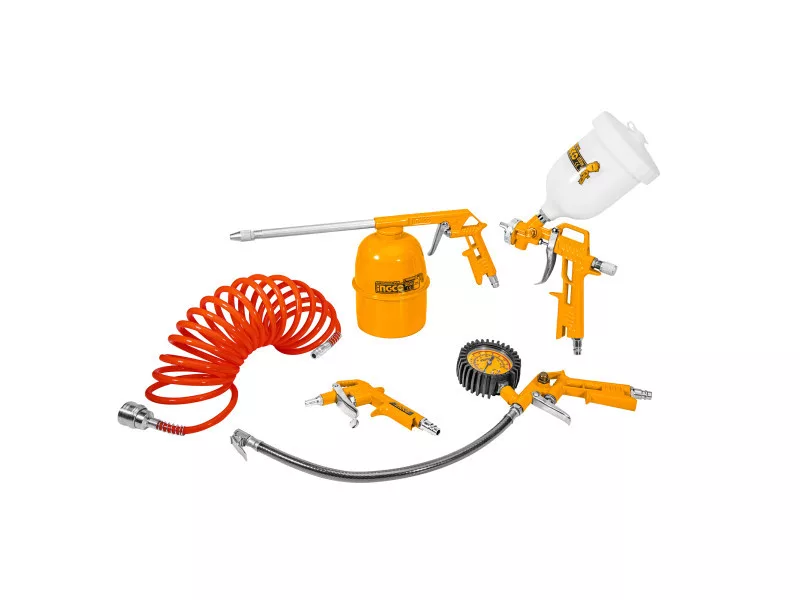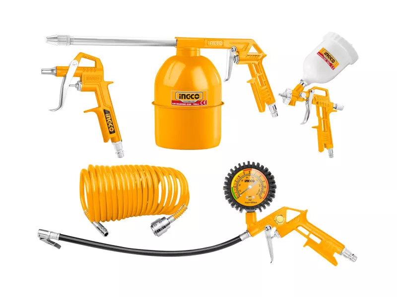 Lieferumfang: Flexibler Schlauch, Ausblaspistole, Farbspritzpistole, Ölspritzpistole, Reifenaufblasgerät, im Karton
