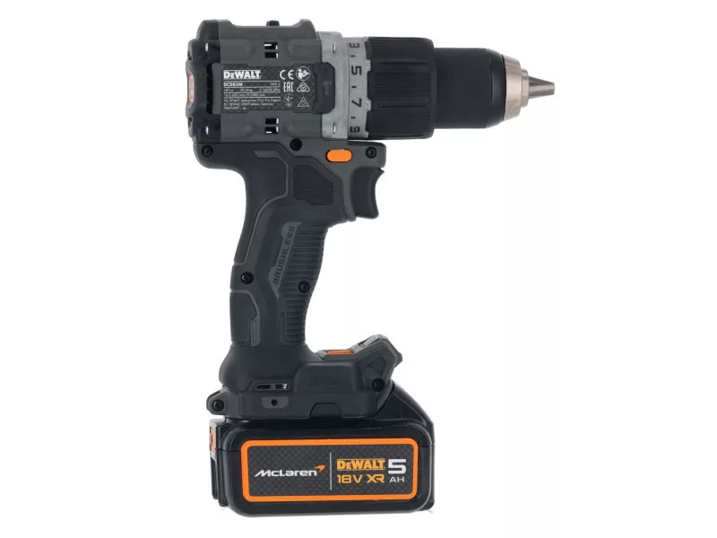 A készlet tartalma: DCD85M DEWALT x McLaren 18V XR ütvefúró-csavarozó, 2 x 5 Ah akkumulátor, DCB1104 4 A töltő, TSTAK kompatibilis dobozban.
