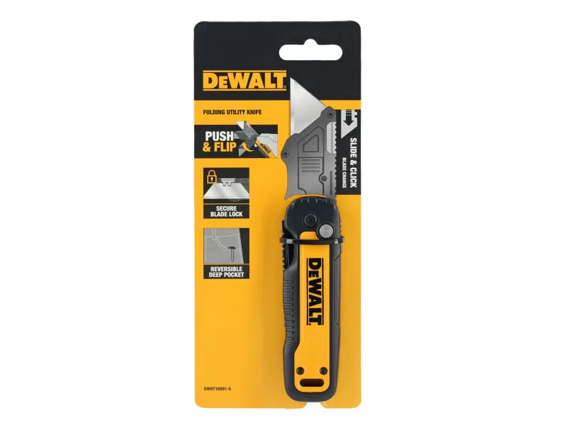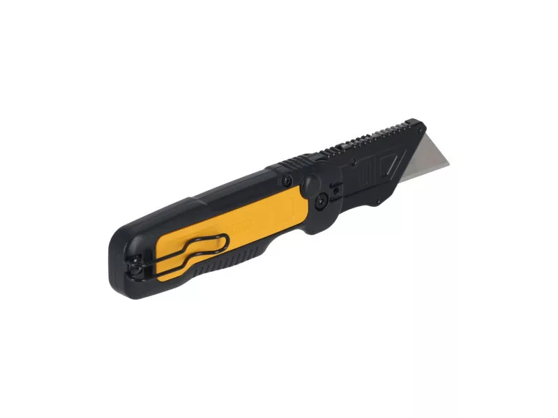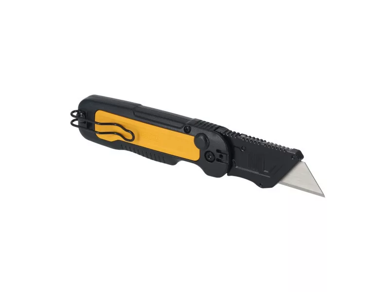 Das DEWALT® Push and Flip Klappmesser mit Trapezklinge bietet ein breites Spektrum an Schneidanwendungen. Mit seinem ergonomischen Design ist es auch bei schweren Arbeiten bequem zu tragen und kann mit einer Hand aufgeklappt werden. Mit einem Handgelenksschwenk ermöglicht es einen schnellen Zugang zur Klinge. Das schnell gleitende und klickende Klingentauschsystem hält die Klinge fest und hilft, das versehentliche Auslösen der Klinge zu verhindern. Das für Langlebigkeit konzipierte Messer mit Metallgriff bietet hohe Leistung für eine Vielzahl anspruchsvoller Aufgaben und kann mit dem umkehrbaren Taschenclip und dem integrierten Seilloch sicher befestigt werden, wenn in der Höhe gearbeitet wird.