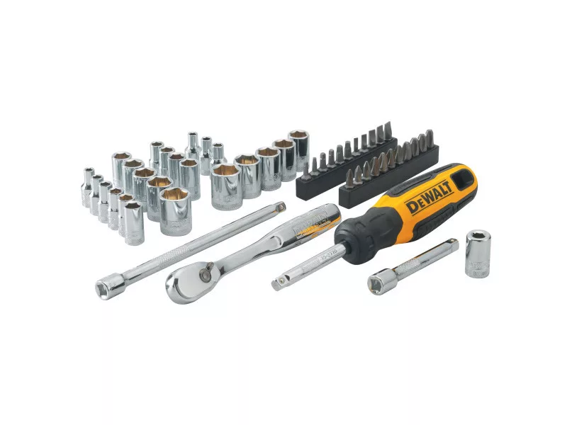 Das DEWALT® 50-teilige mechanische Werkzeugset enthält verschiedene 0,635 cm Antriebswerkzeuge und 22 Spitzen. Das Design mit 72 Zähnen ermöglicht eine 5-Grad-Schwenkbewegung für Manöver auf begrenztem Raum. Diese Werkzeuge sind vollständig poliert und mit korrosionsbeständigem Chrom beschichtet. 72 Zahn Birnenkopfratsche für bessere Zugänglichkeit – 5° Bogen.