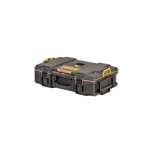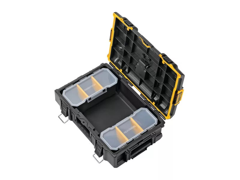 Der patentierte ToughSystem 2.0 DS166 Werkzeugkasten mit automatischer Seitenverriegelung ist einfach und sogar mit einer Hand zu bedienen. Darüber hinaus ist er mit einem zweiteiligen, metallischen Frontverschluss ausgestattet, der eine sichere Aufbewahrung der Werkzeuge gewährleistet. Der Werkzeugkasten bietet 20% mehr Stauraum*, wenn er zusammen mit den 2.0 DS300 und DS400 Einheiten gestapelt verwendet wird. Er ist staub- und wasserdicht nach IP65 und hat eine Tragfähigkeit von 50 kg. Im Werkzeugkasten befinden sich 2 große Organizer-Fächer mit abnehmbaren Trennwänden für eine optimale Anordnung. Der ToughSystem 2.0 Werkzeugkasten ist mit allen ToughSystem Produkten kompatibel. Die Dichtung auf dem Deckel bietet effektiven Schutz gegen Staub und Wassertropfen (IP65) und hält auch extremen Wetterbedingungen stand.
