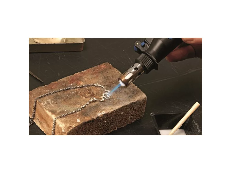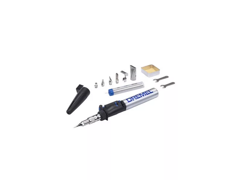Der Dremel VersaTip ist eine vielseitige, kabellose Lötspitze, die mit Butangas betrieben wird und für viele Anwendungsbereiche, von Löten bis Pyrographie, verwendet werden kann. Es bietet variable Temperaturregelung, eine Flammenverriegelung für den Dauerbetrieb und eine Sperre zur Vermeidung von Unfällen.