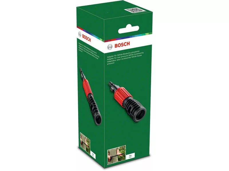 Dieser praktische Adapter ist die Antwort auf die Nachfrage nach einem umfangreicheren Waschzubehörset. Es wurde entworfen, um die meisten Niederdruck-Nilfisk-Zubehörteile mit den Elementen der Bosch Aquatak Produktreihe zu verwenden. Es kann einfach an die Bosch Waschpistole angeschlossen werden, wodurch die kompatiblen Nilfisk-Zubehörteile, einschließlich der kurzen, multifunktionalen oder rotierenden Bürsten, schnell in Betrieb genommen werden können, was für mehr Flexibilität und qualitativ hochwertige Arbeit bei Outdoor-Reinigungsaufgaben sorgt.