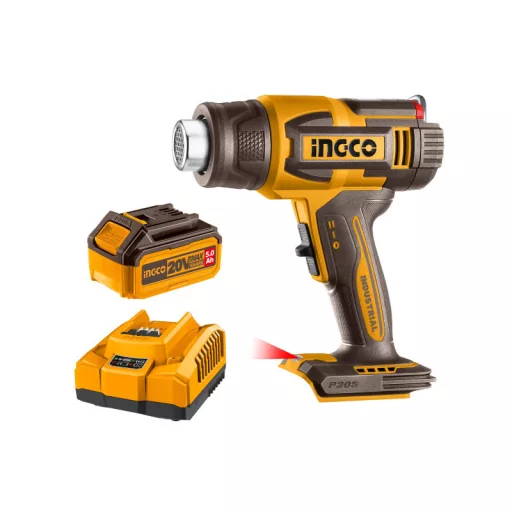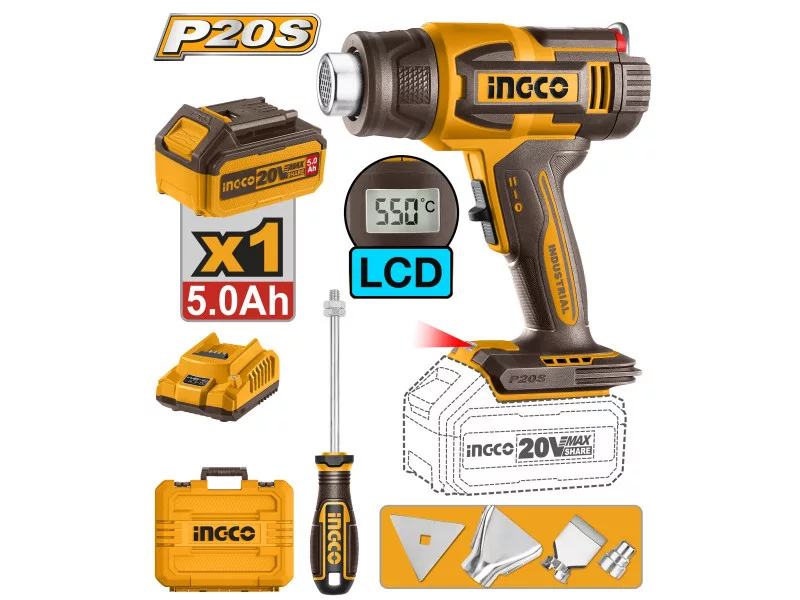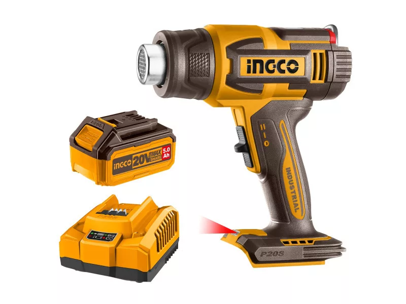 INGCO Akku-Heißluftpistole 550°C LCD-Anzeige 20 V (1 x 5,0 Ah Akku + Ladegerät)