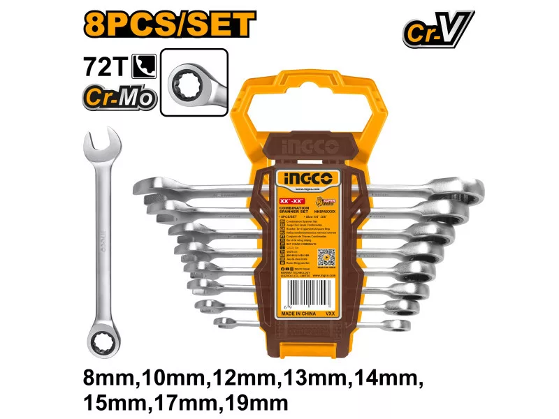 Szállítási terjedelem: 8 db racsnis csillag-villáskulcs, Műanyag akasztó