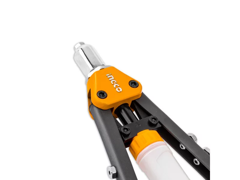 "1. Fähig, Nieten in drei Größen einzutreiben: 3,2, 4,0, 4,8, 6,0 und 6,4mm. Die 4,8mm-Düse ist am Kopf der Pistole montiert.