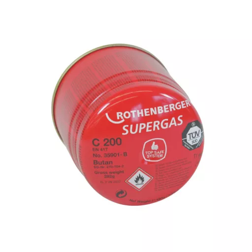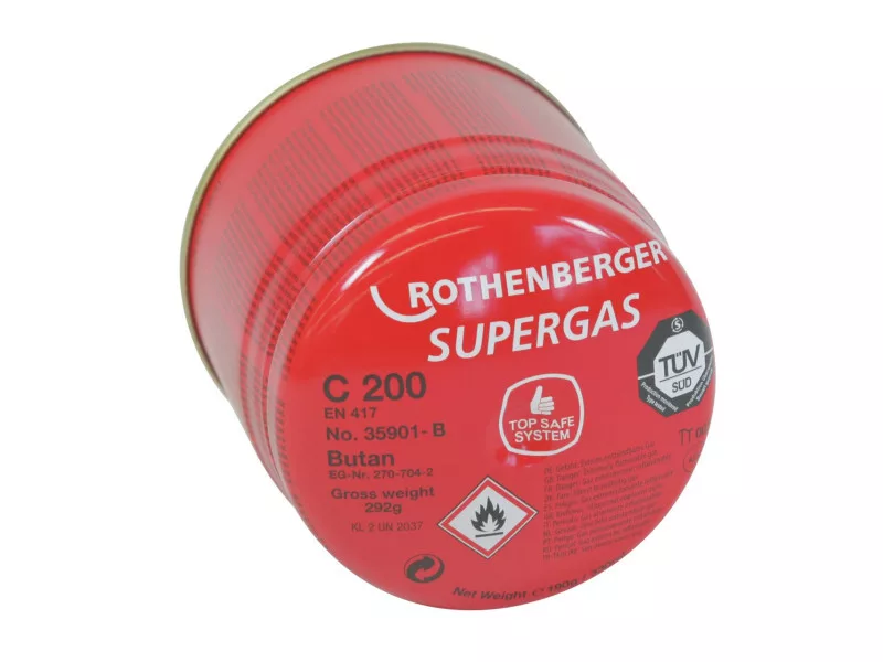 A ROTHENBERGER C 200 felszúrható palack magas fokú biztonságot és nagy teljesítményt kínál. A ROTHENBERGER ROFLAME PIEZO forrasztókészülékkel együtt 1800 °C-os lánghőmérséklet is elérhető, és így alkalmas legfeljebb 22 mm átmérőjű csövek lágyforrasztására.