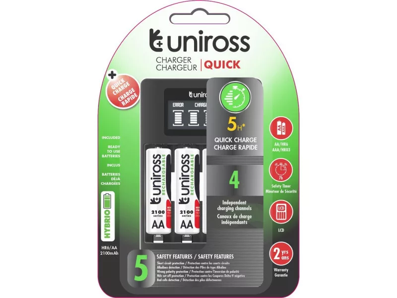 UNIROSS Kompakt-Schnellladegerät + 4 AA/Bleistiftbatterien 1,2 V 2100 mAh