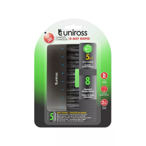UNIROSS Prozessor-Schnellladegerät mit 8 Schächten für AA/AAA, inklusive Schutzfunktion