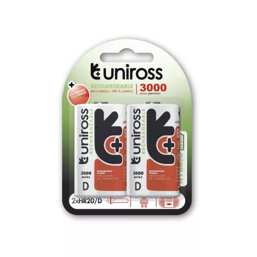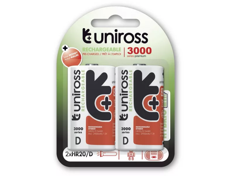 Die wiederaufladbaren Uniross-Akkus überzeugen im Vergleich zu ihren Alkali-Kollegen, da sie in 80% ihres Entladezyklus eine gleichmäßige Spannung liefern.