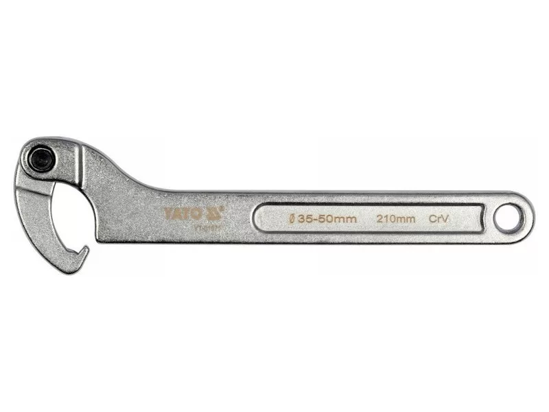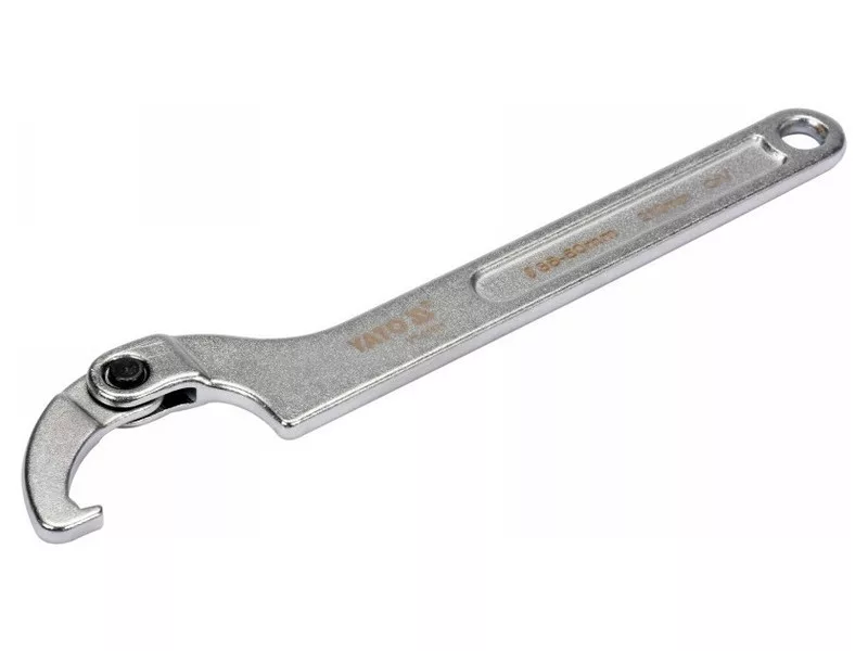 Hook-and-loop, toggle wrench made of heavy-duty CrV chrome vanadium steel. It has a matte chrome-plated surface finish. Designed for round slotted nuts.