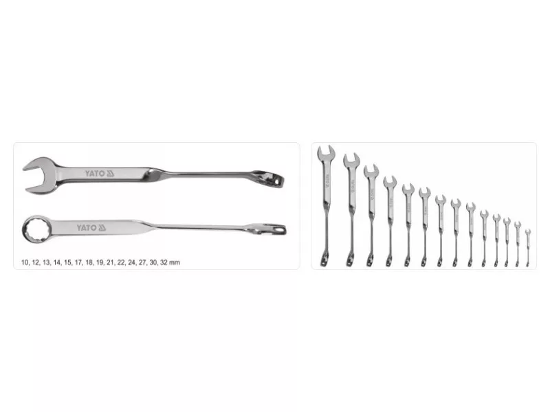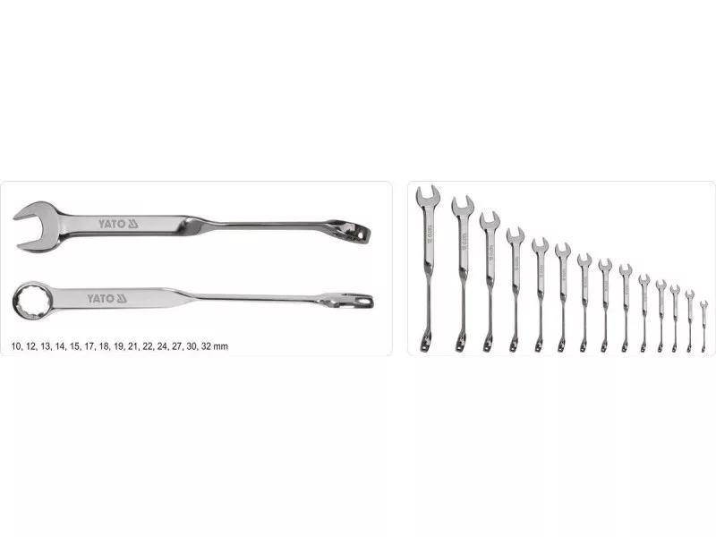 Set of twisted open-ended wrenches 10 - 32mm by YATO YT-01865.Wrenches made of high-quality steel.Ergonomic twisted shape facilitates work and provides great comfort, especially in the case of heavily seized screws.