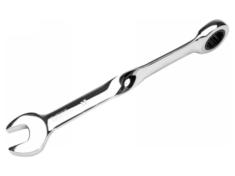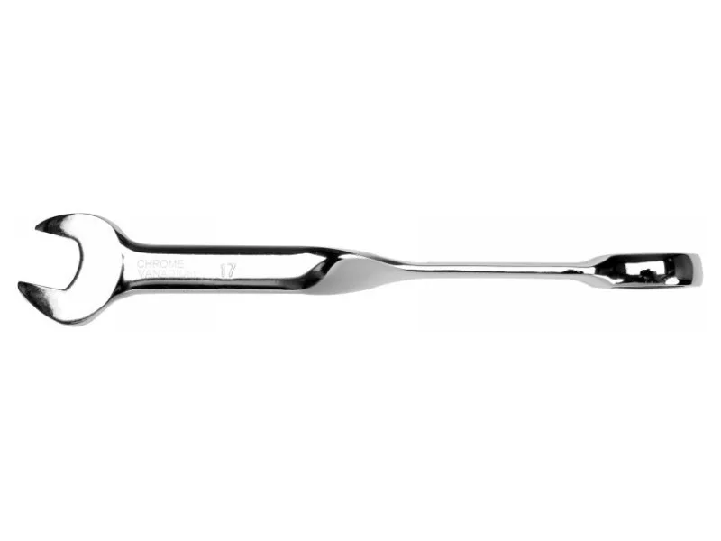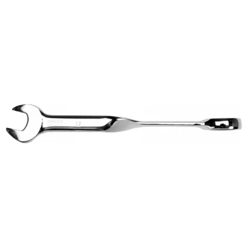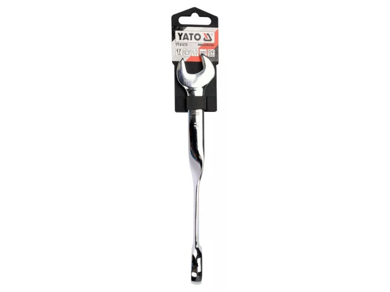 A twisted ring wrench with a ratchet of 17mm by YATO YT-01879. The wrench ends with a ratchet eyelet on one side and a flat end on the other. The ergonomic twisted shape makes it easy to work and provides great comfort, especially with tightly seized screws. - handle twisted by 90° fits perfectly in the hand, transferring more pressure to the wrench when tightening screws, with less strain on the user - ratchet allows for faster tightening and loosening of screws - head tilted by 15° - made of high-quality CrV steel, polished surface - hardness: 40-45 HRC - 72 teeth.