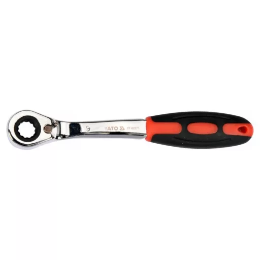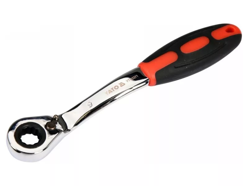 A wrench with a ratchet and a bent profile designed for loosening screws. Recommended for automotive services.