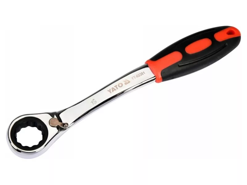 A wrench with a ratchet and a bent profile designed for loosening screws. Recommended for automotive services.