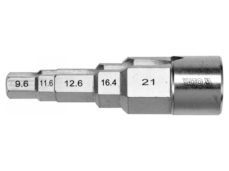 A 3/8" (9.6 mm) / 29/68" (11.6 mm) / 1/2" (12.6 mm) / 21/32" (16.4 mm) / 27/32" (21 mm) drive 1/2" step wrench made of high-grade CRV steel. On both sides it has a notch designed for screwówrench with tabs.