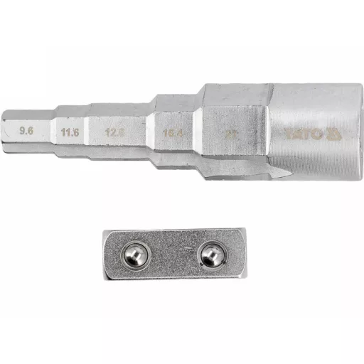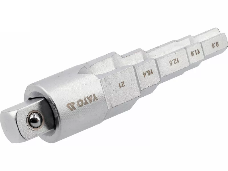 Graduated key with a 1/2" drive designed for installation work on heating fittings and threaded connections. Made of chrome-vanadium steel (CrV), it ensures high resistance to torsional loads and wear during frequent use. The graduated construction allows for handling multiple diameters with one tool, and the notches on both sides enable secure fitting in screws with protrusions.