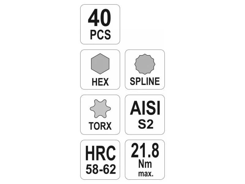 • Types of tips: Torx, hexagonal (Hex), Spline
