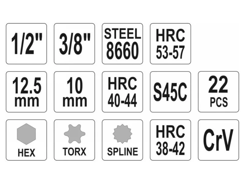 • Hardness: HRC 40-44 (S45C), HRC 38-42 (CrV), HRC 53-57 (8660)