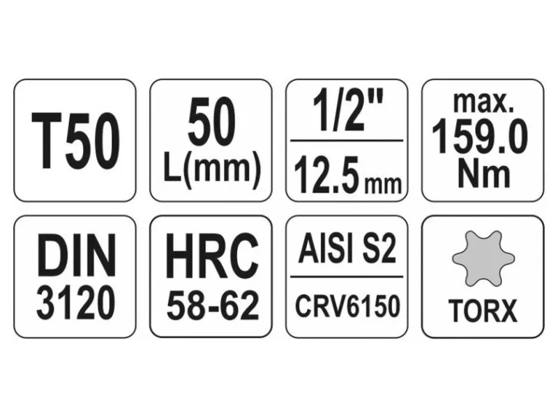 Professional Torx pushes, 1/2 "cap size, T50 size. Chrome -shaped cap made of CRV6150 steel, aisi S2 steel mandrel and covered with a layer of nickel. An irreplaceable tool in a car or mechanical workshop.