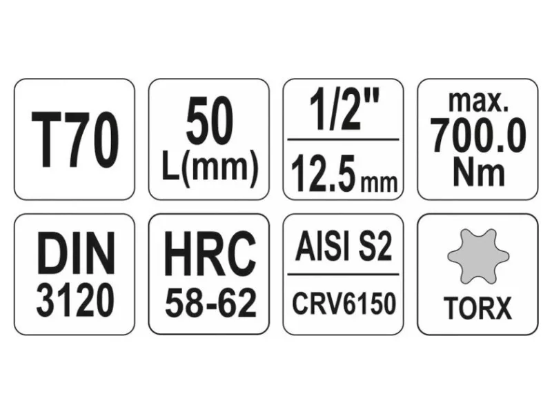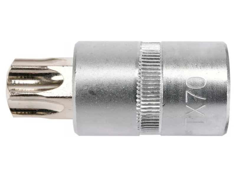Professional Torx pushing key, 1/2 "cap size, T70 size size. Chrome cap is made of CRV6150 steel, aisi S2 steel mandrel and covered with a layer of nickel. An irreplaceable tool in a car or mechanical workshop.