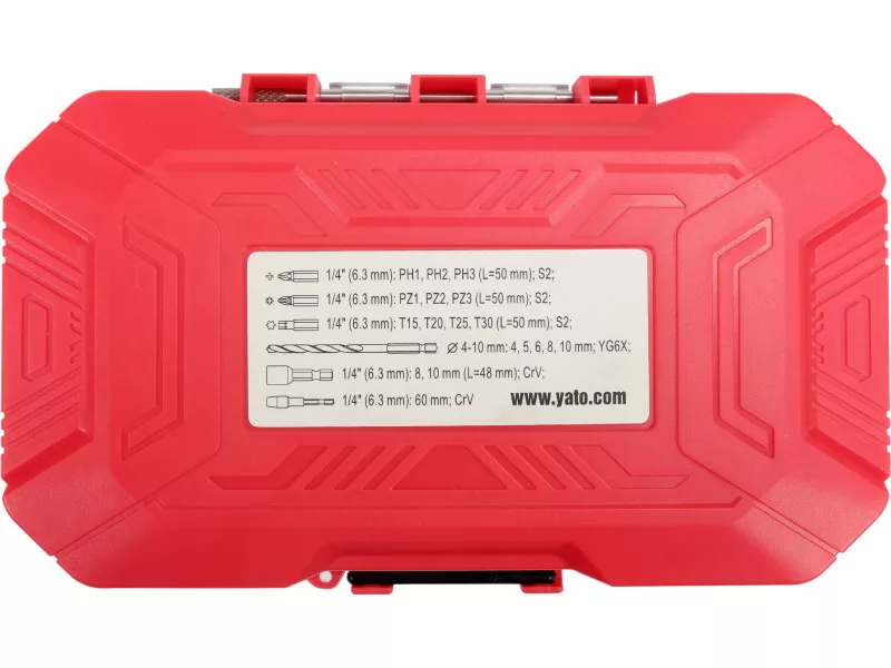 - 10 bits 50 mm: Pozidriv: PZ1, PZ2, PZ3, Torx: T15, T20, T25, T30, Phillips: PH1, PH2, PH3), made of acid-resistant steel AISI S2