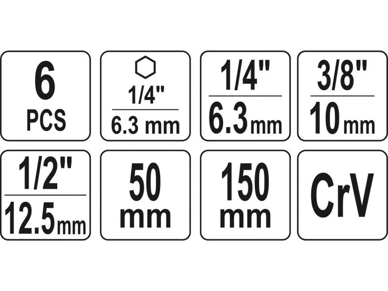 - length [mm]: 50 mm (1/4", 3/8" and 1/2") and 150 mm (1/4", 3/8" and 1/2")
