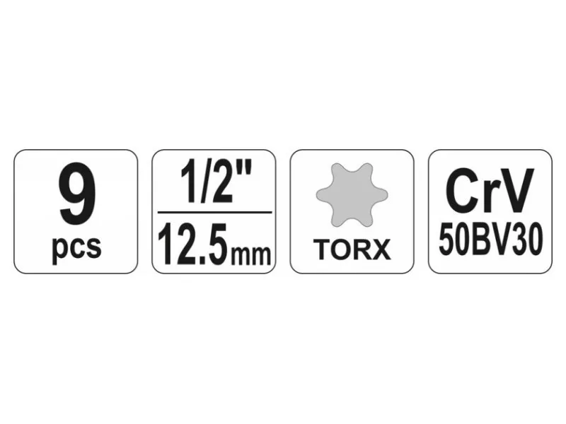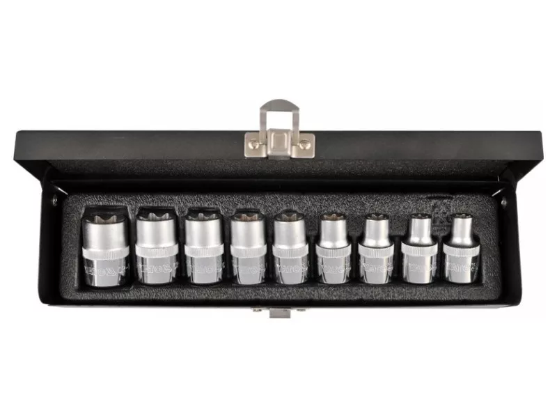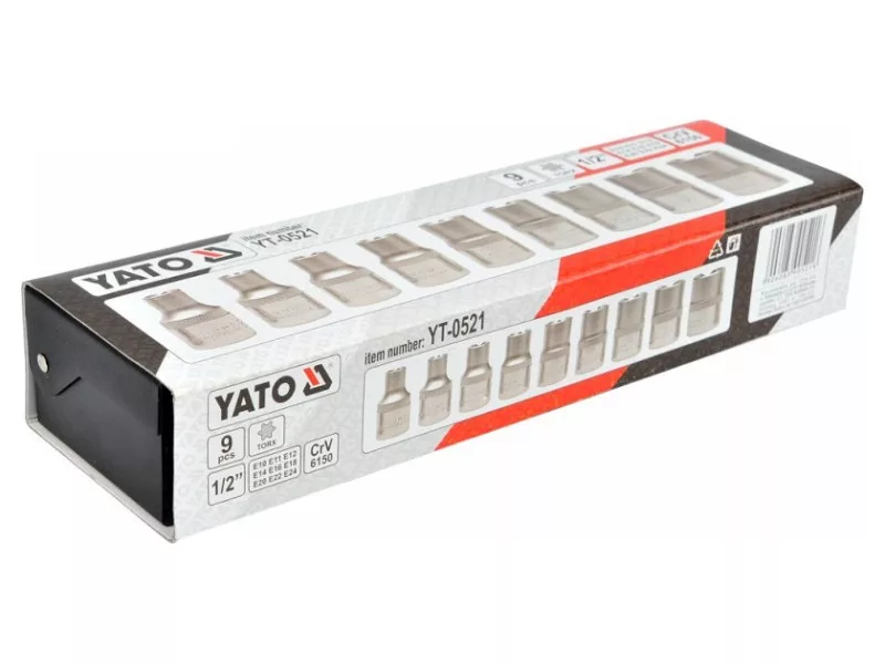 A set of specialized TORX attachments, used in motorization, mechanics and electronics. The attachments are made of CRV 6150 chrome-vanadium steel, which guarantees their strength and long life. The kit includes attachments cooperating with yato rattles. 1/2 "caps: E10, E11, E12, E14, E16, E18, E20, E22, E24 Suit
