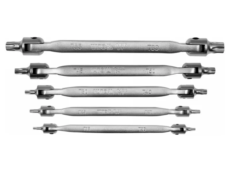 A set of articulated key wrenches TORX T15-T60 by YATO YT-05320. Designed for industrial, workshop and service applications. • Made of CRV steel, satin surface • Motion range: 220 ° • useful when unscrewing hard to reach screws. T15 x T20 T25 x T27 T30 x T45 T45 x T50 T55 x T60