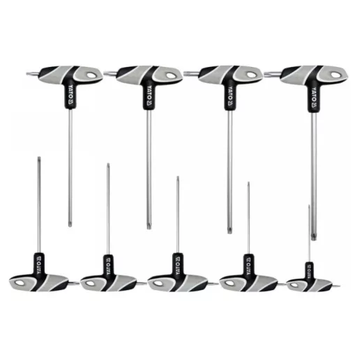 Professional Torx mandrel set with a handle. The set contains 9 elements. Sizes T10, T15, T20, T25, T27, T30, T40, T45, T50. The mandrels are made of S2 steel. An irreplaceable set in a car and mechanical workshop.