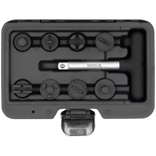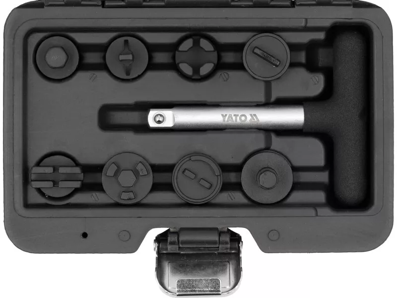 A set of spanners designed to safely unscrew and screw on plastic oil plugs. Sliding T-bar provides the correct screwing torque so that the plugs do not bake into the oil pan threads. It can handle 8 types of plugs on Audi, BMW, Dodge, Ford, Lincoln, Mercedes and VW vehicles.