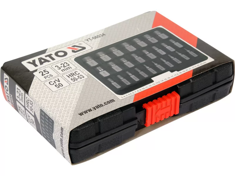 Made of high quality CRV 50 steel with HRC 50-53 hardness. Its innovative spiral profile slides into the head of the bolt and allows safe removal of the bolt that has been locked. The complete set includes 25 unscrews in working ranges of 3mm to 23mm.