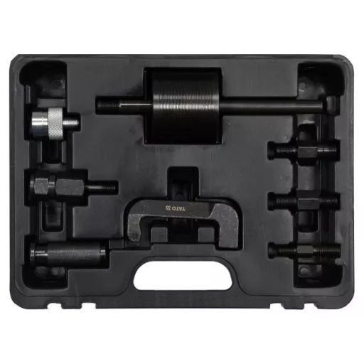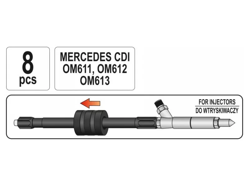Professional kit for quick removal of baked common rail fuel system injectors from the engine head of carsóMercedes CDI. Fits injectors from manufacturersósuch as: Bosch, Denso, Delphi and Siemens. The kit includes 8 elementsów: inertia hammer, joint for working in hard-to-reach places and adapters.