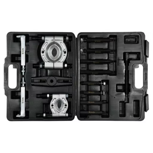 Two-arm puller for removal of bearings, gearóheads, brake discs etc. Comes with separators to help remove tight-fitting components and a set of center bolts. Recommended for automotive and mechanical services.