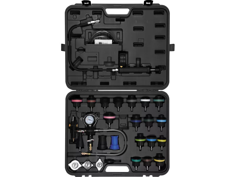 28-piece set for testing radiator leaksós and for making a quick coolant change.Color-coded caps make it easy to chooseór the right test cap. The tester is designed for car serviceós, diagnostic stations, etc.