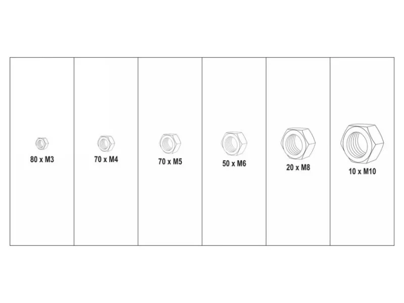 | Set includes | nuts x300 (M3 x80, M4 x70, M5 x70, M6 x50, M8 x20, M10 x10) |
