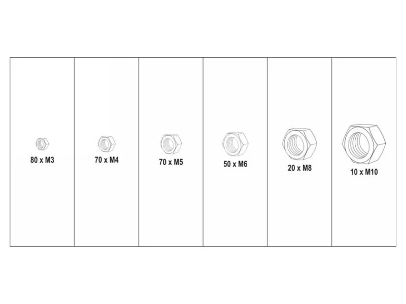 | Set includes | nuts x300 (M3 x80, M4 x70, M5 x70, M6 x50, M8 x20, M10 x10) |