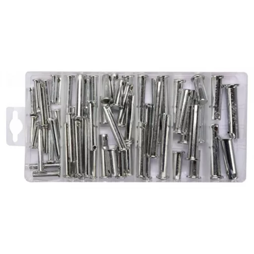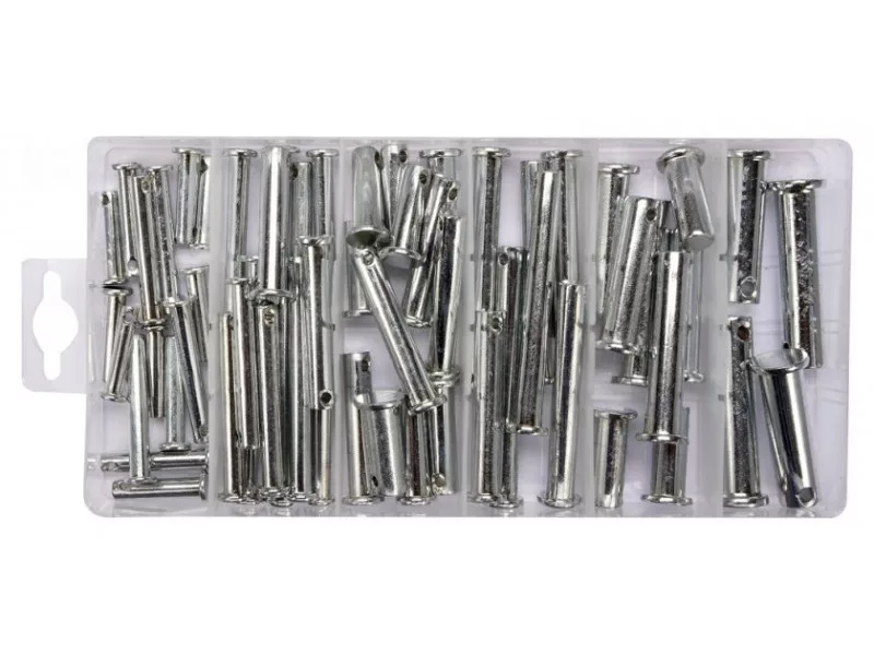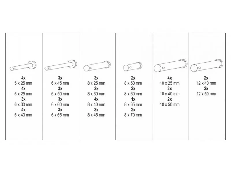 Set includespins with head and hole x60 (5x25 mm x4, 6x25 mm x4, 6x30 mm x3, 6x40 mm x4, 6x45 mm x3, 6x50 mm x3, 6x60 mm x3, 6x65 mm x3, 8x25 mm x3, 8x30 mm x3, 8x40 mm x4, 8x45 mm x3, 8x50 mm x2,