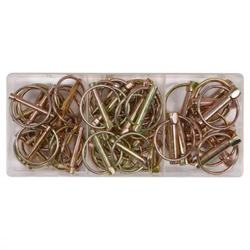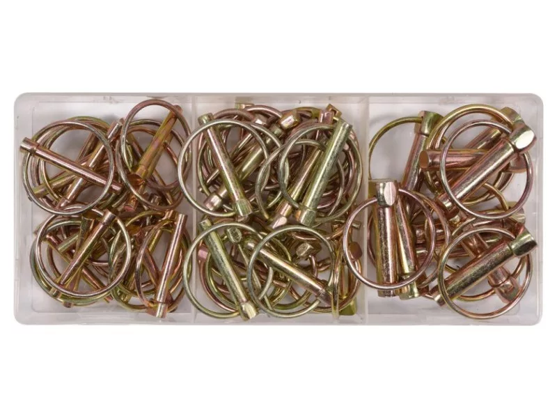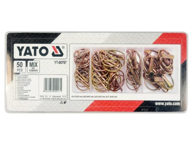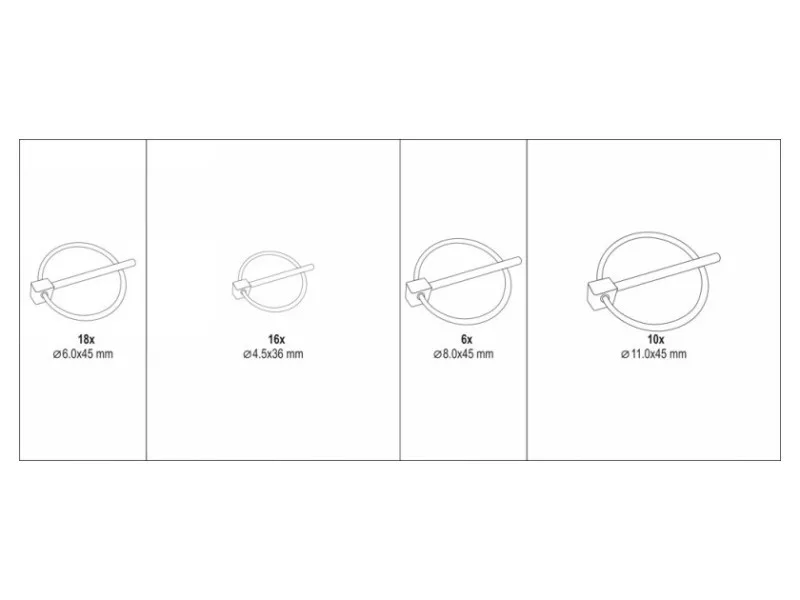 Set includescotter pins with ring x50 (Ø4.5x36 mm x16, Ø6x45 mm x18, Ø8x45 mm x6, Ø11x45 mm x10)