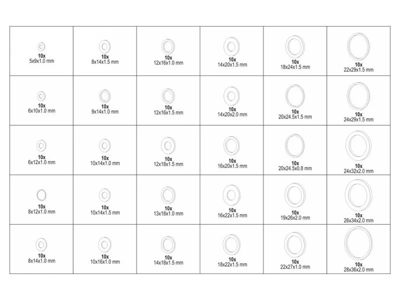 A set of 300 pieces of aluminum pads for oil trigger traffic jams. The kit includes 5x9x1.0 mm to 28x36x2.0 mm. The whole is placed in a convenient "sorter" packaging.