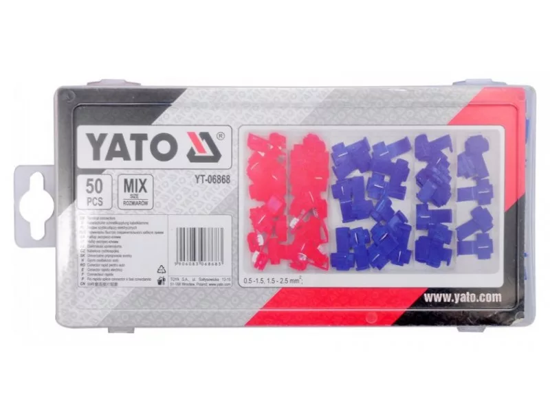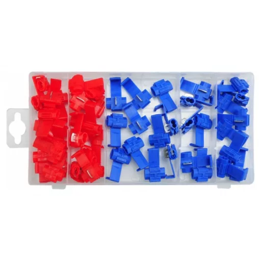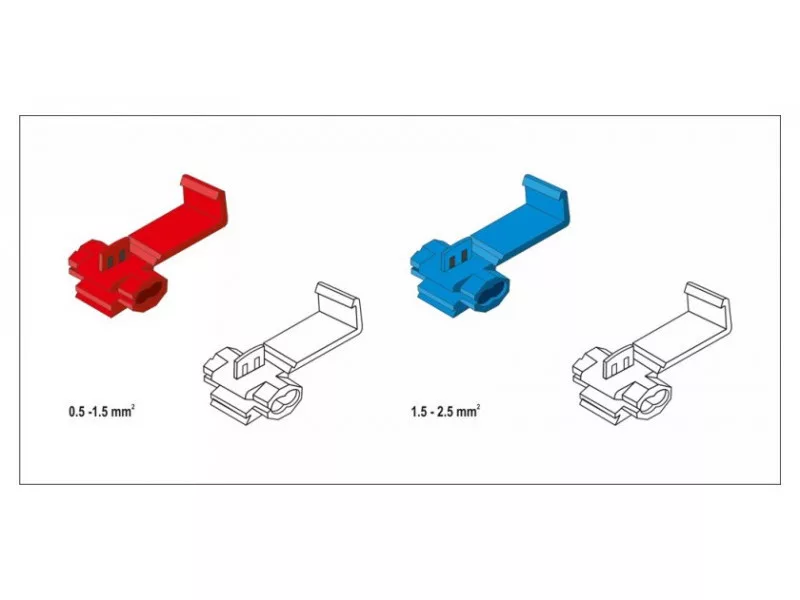 The set of electric quick connections contains fast connections in two colors and sizes matching the most popular diameters of electric wires. The set contains 50 elements, and the whole is placed in a convenient "sorter" packaging.