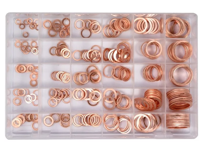 A set of 300 pieces of soft copper pads. The kit includes sizes from 5x9x1 mm to 28x36x2 mm. The whole is placed in a convenient "sorter" packaging.